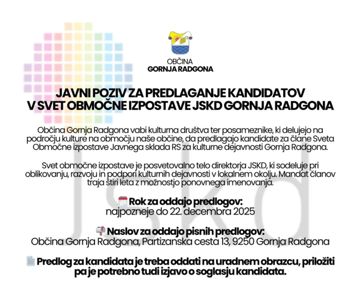 Na podlagi 27. člena Akta o ustanovitvi Javnega sklada Republike Slovenije za kulturne dejavnosti (Uradni list RS, št. 72/2010) in poziva direktorice Javnega sklada RS za kulturne dejavnosti, št. 0131-22/2025-1 z dne 17. 11. 2025, Občina Gornja Radgona poziva kulturna društva ter posameznike s področja kulturnih dejavnosti, ki delujejo na območju občine Gornja Radgona, da podajo predloge kandidatov za člane v Svet Območne izpostave Javnega sklada za kulturne dejavnosti Gornja Radgona. Svet območne izpostave je posvetovalno telo direktorja sklada; imenuje ga direktor sklada na predlog samoupravnih lokalnih skupnosti z območja, ki ga pokriva; mandat članov traja štiri leta z možnostjo ponovnega imenovanja.