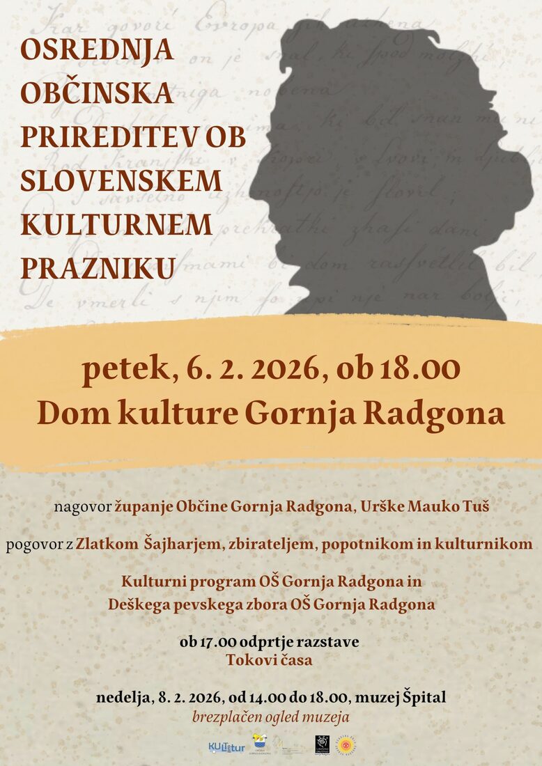 Ob slovenskem kulturnem prazniku vas prijazno vabimo na Osrednjo občinsko prireditev ob slovenskem kulturnem prazniku, ki bo potekala v petek, 6. februarja 2026, v Domu kulture Gornja Radgona.
