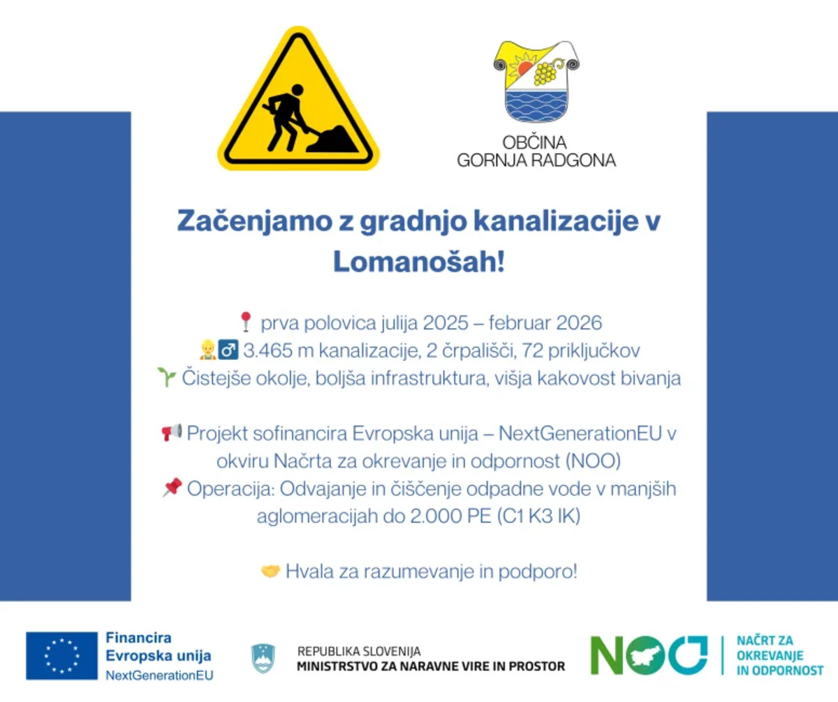 Občina Gornja Radgona je pristopila k pomembnemu okoljskemu projektu – izgradnji fekalne kanalizacije v naselju Lomanoše. Gre za investicijo v javno infrastrukturo, katere namen je izgradnja energetsko učinkovitega sistema za odvajanje in čiščenje komunalne odpadne vode. S tem se bodo odpravile dolgoletne težave z onesnaževanjem podzemne in površinske vode ter izboljšalo splošno okolje in kakovost življenja prebivalcev.