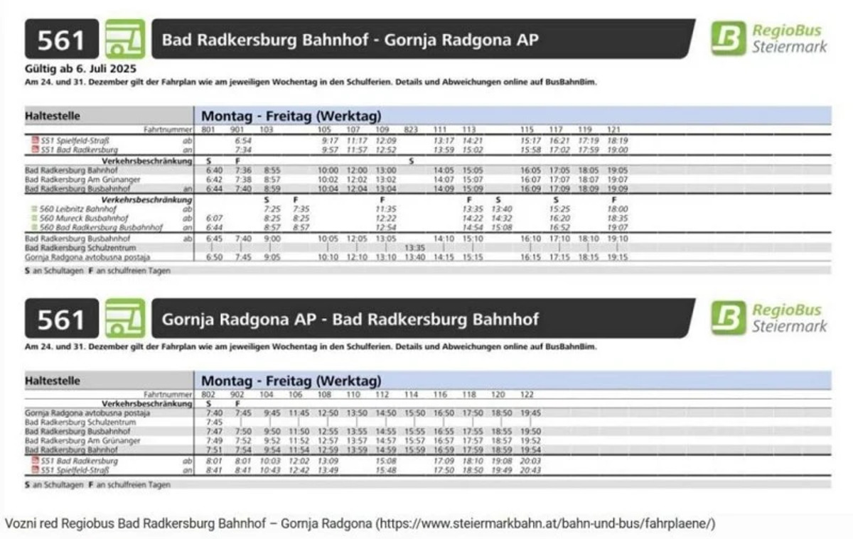Po dogovoru s prevoznikom Steiermarkbahn lahko dijaki kupijo sezonsko vozovnico linije 561 po enaki ceni kot avstrijski dijaki – 19,60 €. Obvezni pogoj: dijak izpolni obrazec, ki ga prejme v šoli, in ga odda v info točki / turistični pisarni na Hauptplatz 14 v Bad Radkersburgu. Dijaki imajo tudi možnost nakupa sezonske karte za celotno avstrijsko Štajersko po ceni 140,00 €. Več informacij o vozovnicah in voznih redih je na voljo pri Regiobus in Steiermarkbahn.