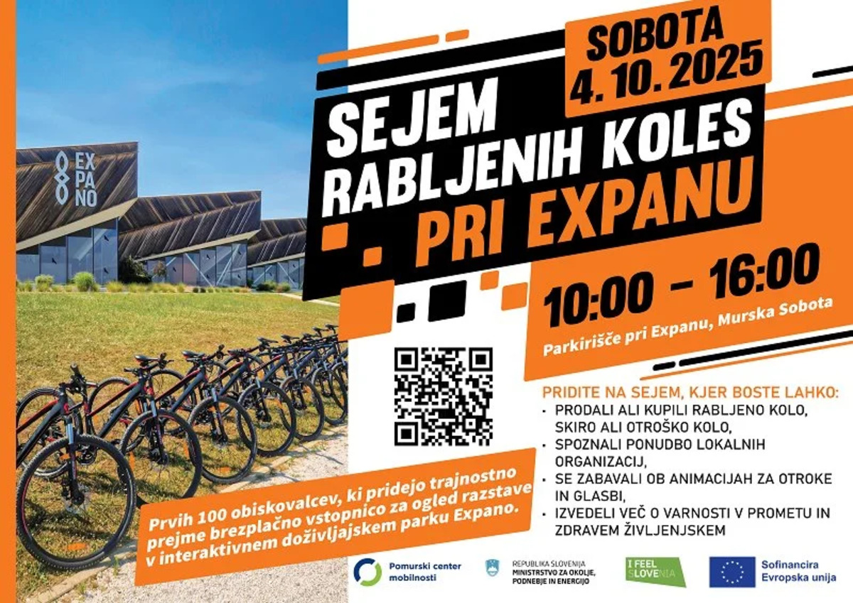 Pomurski center mobilnosti vabi na regijski sejem rabljenih koles, ki bo potekal v soboto, 4. oktobra 2025, od 10. do 16. ure, na parkirišču pri Expanu v Murski Soboti. Prvih 100 obiskovalcev, ki bodo na dogodek prišli na trajnosten način, bo prejelo brezplačno vstopnico za ogled razstave v interaktivnem doživljajskem parku Expano.