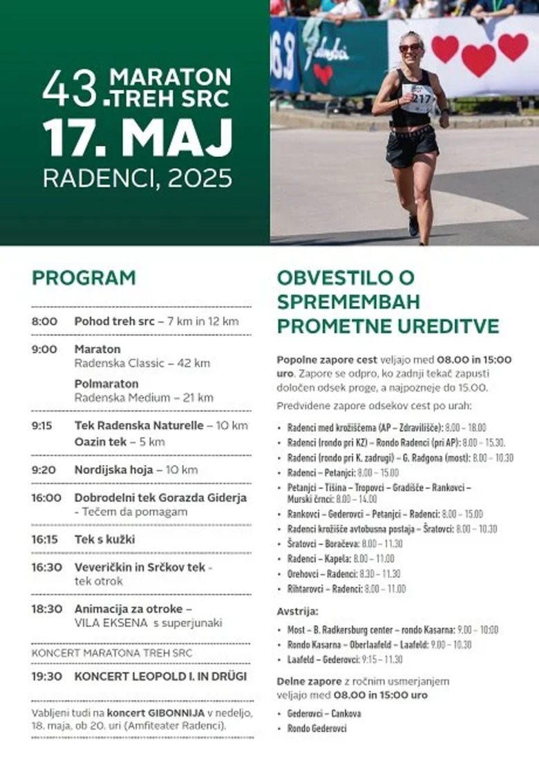 Organizator tradicionalne športne prireditve - Maraton treh src obvešča javnost o spremembah prometne ureditve s popolnimi zaporami cest na trasah maratona (med njimi je tudi naša občina), na dan prireditve, 17. maja 2025.