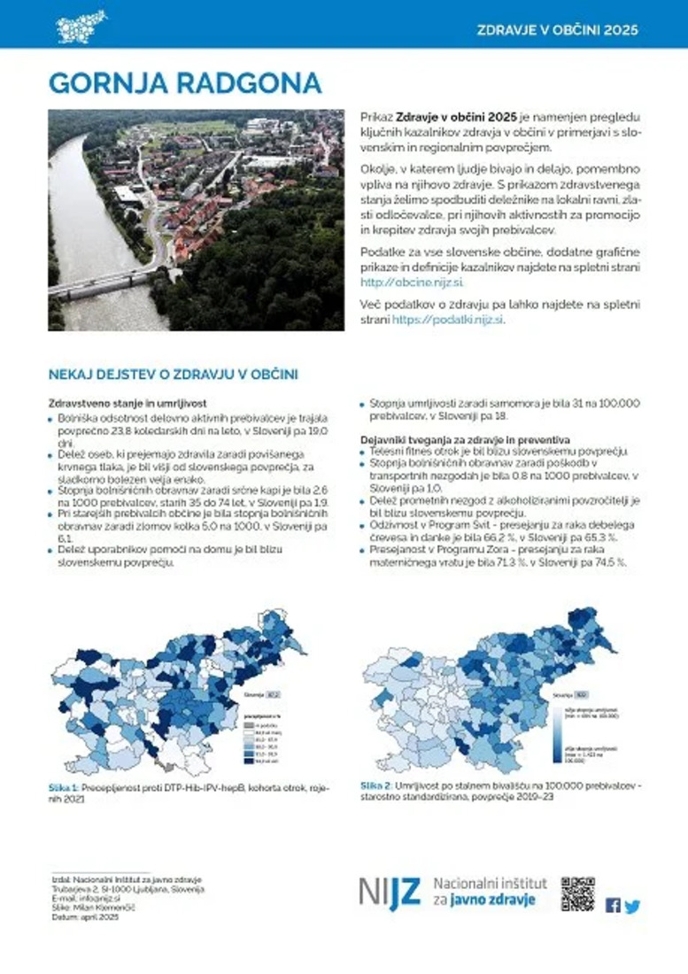 Za vsako občino so pripravljene tudi kratke publikacije, ki poleg splošnega pregleda stanja zdravja vključujejo tudi osrednjo tematiko letošnje objave – podnebne spremembe in oceno ranljivosti občin po podnebnih regijah. Namen tega poudarka je spodbuditi lokalne skupnosti k razmisleku in aktivnemu pristopu k ustvarjanju odpornejšega in bolj zdravega okolja. Kratko publikacijo za Občino Gornja Radgona si lahko ogledate v priponki.