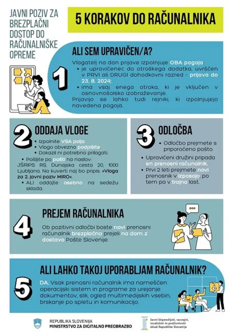 Vlogo je možno oddati do razdelitve razpoložljive računalniške opreme, vendar najdlje do 23. 8. 2024.