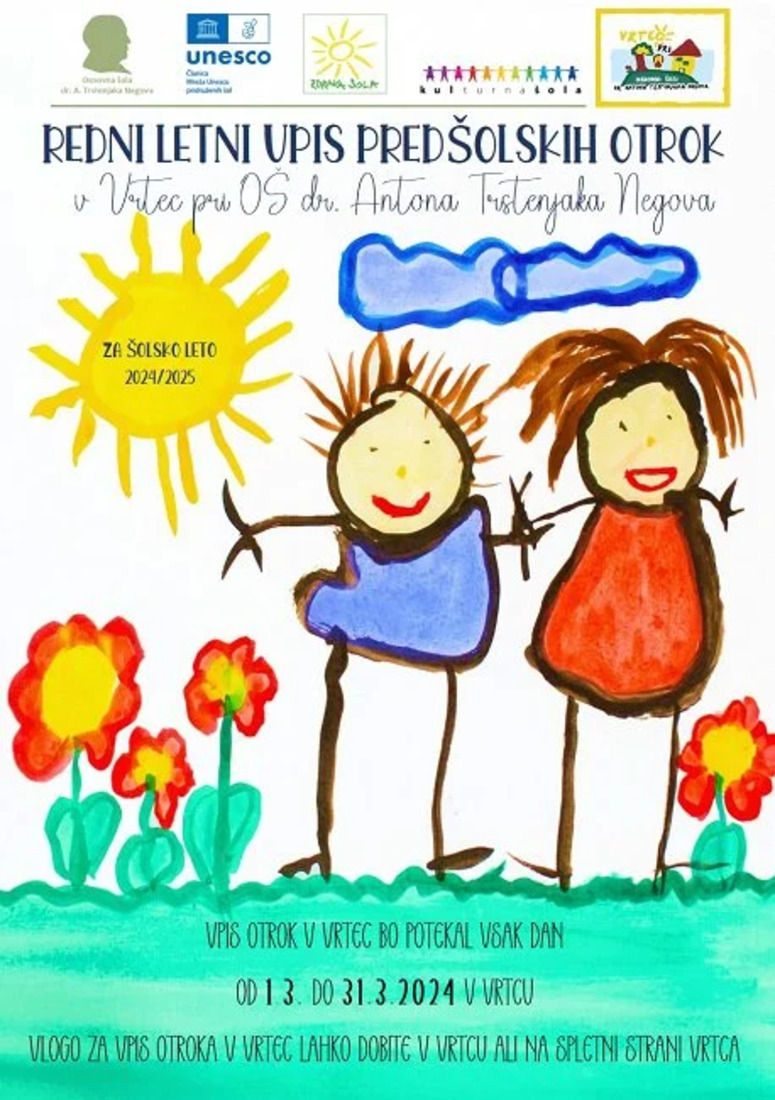 Obvestilo o rednem letnem vpisu predšolskih otrok v Vrtec pri Osnovni šoli dr. Antona Trstenjaka Negova za šolsko leto 2024/2025