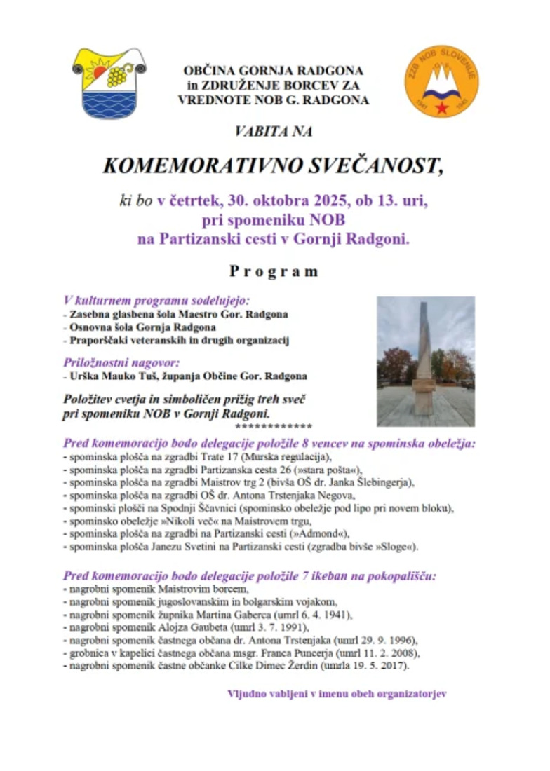 Komemorativna svečanost bo v četrtek, 30. oktobra 2025, ob 13. uri, pri spomeniku NOB na Partizanski cesti v Gornji Radgoni.