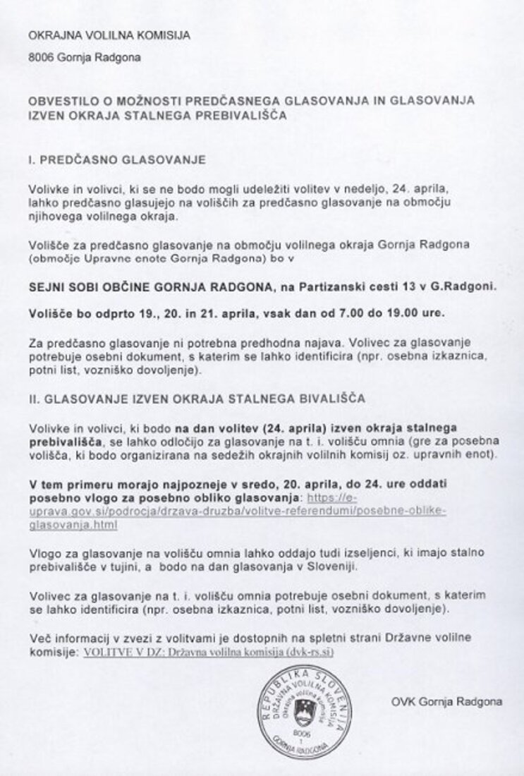 Obvestilo Okrajne volilne komisije - o možnosti predčasnega glasovanja in glasovanja izven okraja stalnega prebivališča (volitve v državni zbor 2022)