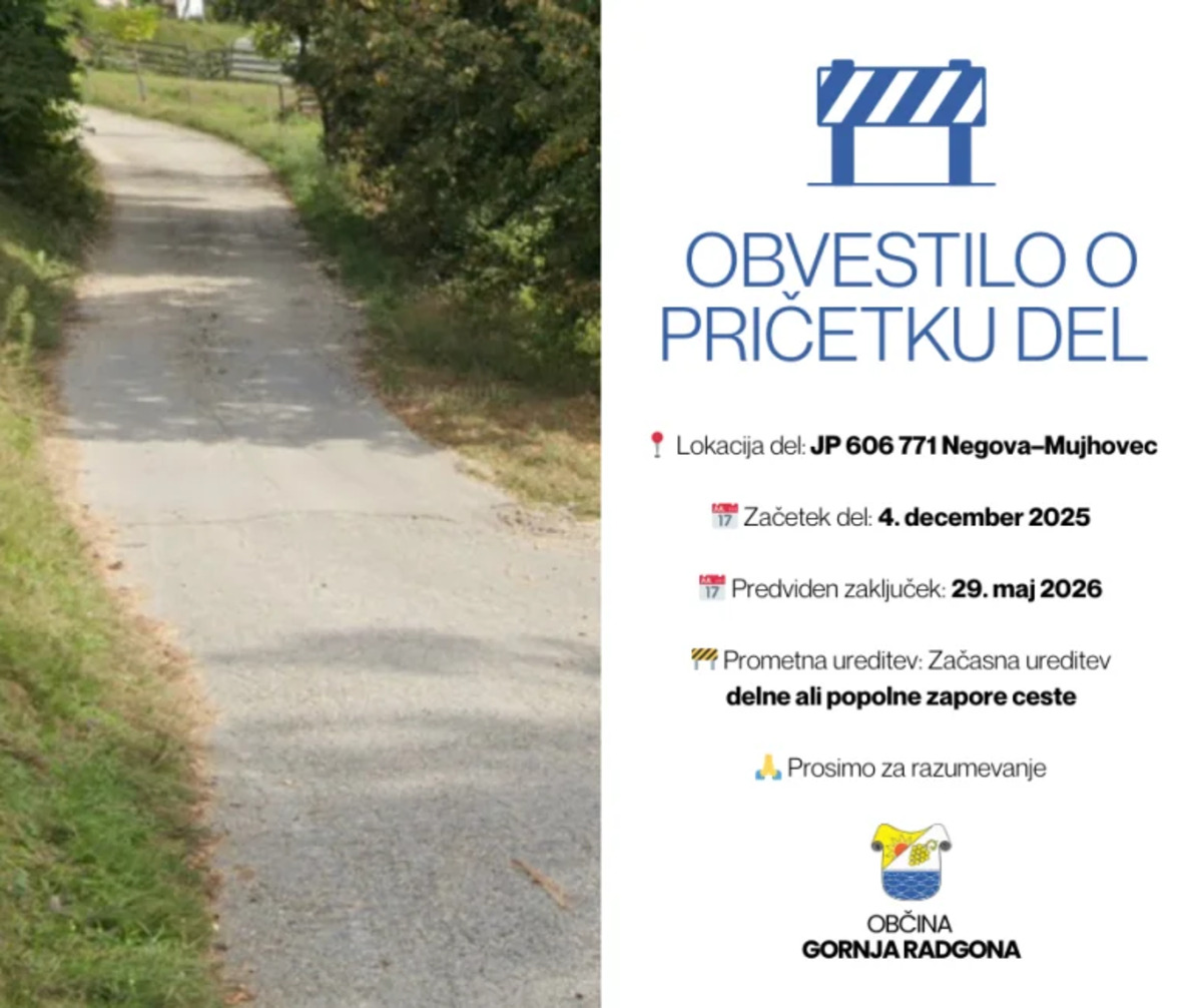 Obvestilo o pričetku del na občinski cesti JP 606 771 Negova–Mujhovec