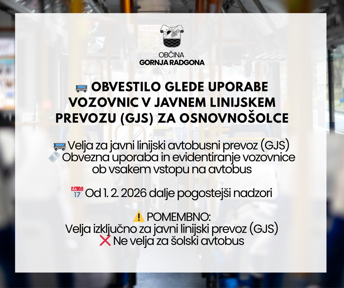 Občina obvešča starše in osnovnošolce, da mora v skladu z veljavno zakonodajo vsak potnik, ki uporablja javni linijski avtobusni prevoz v okviru gospodarske javne službe (GJS), ves čas prevoza imeti pri sebi veljavno vozovnico.
